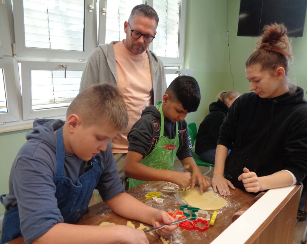 Ältere Schülerinnen und Schüler (Klasse 10) backen und verzieren mit den Kleineren (Klasse 1-4) Plätzchen und verzieren diese anschließend. In jedem Schuljahr erneut eine große Freude aber auch große Anstrengung für alle Beteiligten. Die strahlenden Augen sind unbezahlbar.
